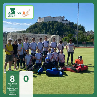 Die Sonne war zwar fein und ließ die gewaltig schöne Kulisse in Salzburg noch mehr strahlen, leider aber auch gnadenlos heiß und fordernd.🥵 Nachdem zwischen erstem und zweitem Spiel nur eine halbe Stunde lag mit ein wenig Schattenpause, wurde es von Viertel zu Viertel trotz genug Tauschmöglichkeiten schwieriger den Zug gegen körperlich starke Lieferinger nach vorne aufrecht zu erhalten.🫠 Mit einem 1:0 Rückstand ging es in die Pause und voll motiviert, das Spiel noch zu drehen ging es weiter. Leider fiel das 2:0 recht bald - Salzburg spielte technisch und wie gesagt körperlich stark und kompromisslos. Unsere Chancen durch Ecken wollten leider nicht rein und aus dem Spiel waren die Möglichkeiten leider zu wenig zwingend.🥴 So konnte Liefering dann noch das 3:0 erzielen und uns gelang leider kein Tor mehr obwohl der Kampfgeist und der Versuch nach vorne zu spielen im 4. Viertel nochmal so richtig Fahrt aufgenommen haben durch das Mobilisieren der letzten Kräfte.